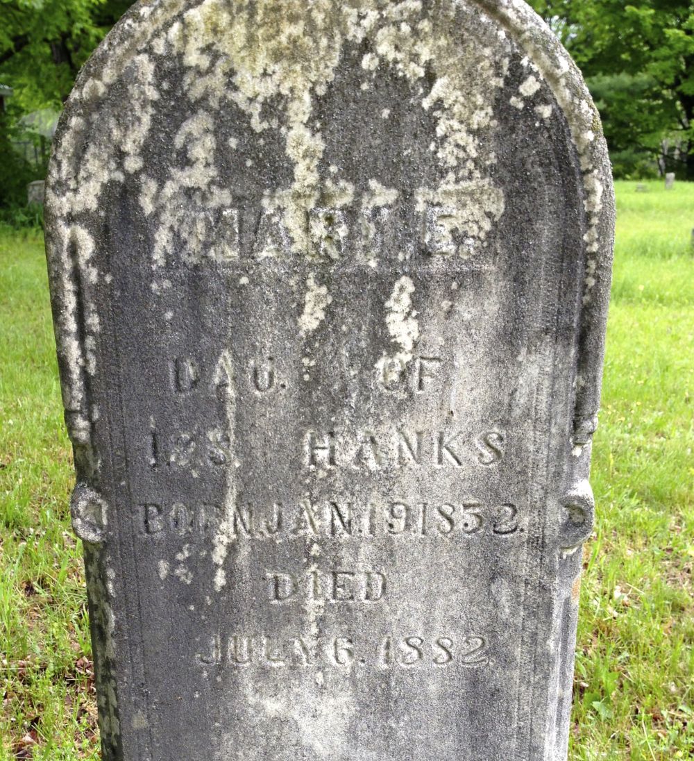 - [S5036] Find A Grave: Lakeville Baptist Church Cemetery, Cossayuna, New York, Mary E Hanks, created by Caroline Hoag, added Jul 2013, memorial number113293053.
