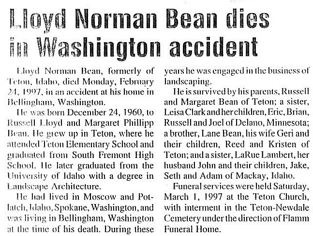 He is survived by his wife, Margaret, of Teton; a sister, Elizabeth Fiedler, of Valencia, CA; children: Lane and Geri Bean, of Teton, LaRue and John Lambert, of Mackay, and Leisa Clark, of Delano, MN; nine grandchildren: Reed and Kristen Bean, Jake, Seth, and Adam Lambert, Joel, Russell, Brian and Eric Clark and his wife, Jennie and their daughter, Elena, Margaret & Russell's first great-grandchild. He was preceded in death by his parents, Lee and Edith Bean; son, Lloyd Norman Bean; siblings and their spouses: Douglas and Joy Bean, Merlin and Norma Bean, Helen and Harold Watson, Miriam Bean, and Lee Siddoway Bean; and brother-in-law, Robert Fiedler.