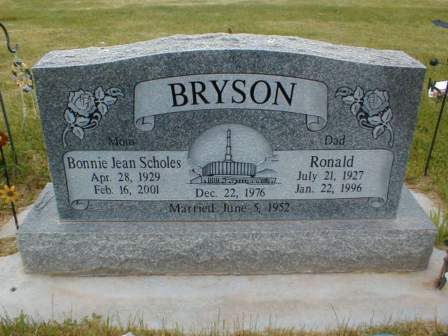 - [S5092] Find A Grave: Roosevelt Memorial Park, Roosevelt, Utah, Bonnie Jean Scholes Bryson, created by Rhonda, added Nov 2008, memorial number 31098176.