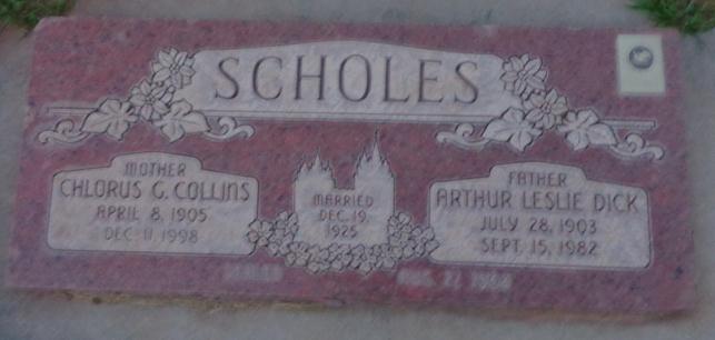 - [S5092] Find A Grave: Roosevelt Memorial Park, Roosevelt, Utah, Chlorus G Collins Scholes, created by Marne Tucker, added Jun 2012, memorial number 92335407.