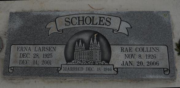 - [S5092] Find A Grave: Roosevelt Memorial Park, Roosevelt, Utah, Rae Collins Scholes, created by Marne Tucker, added Apr 2012, memorial number 88729448.