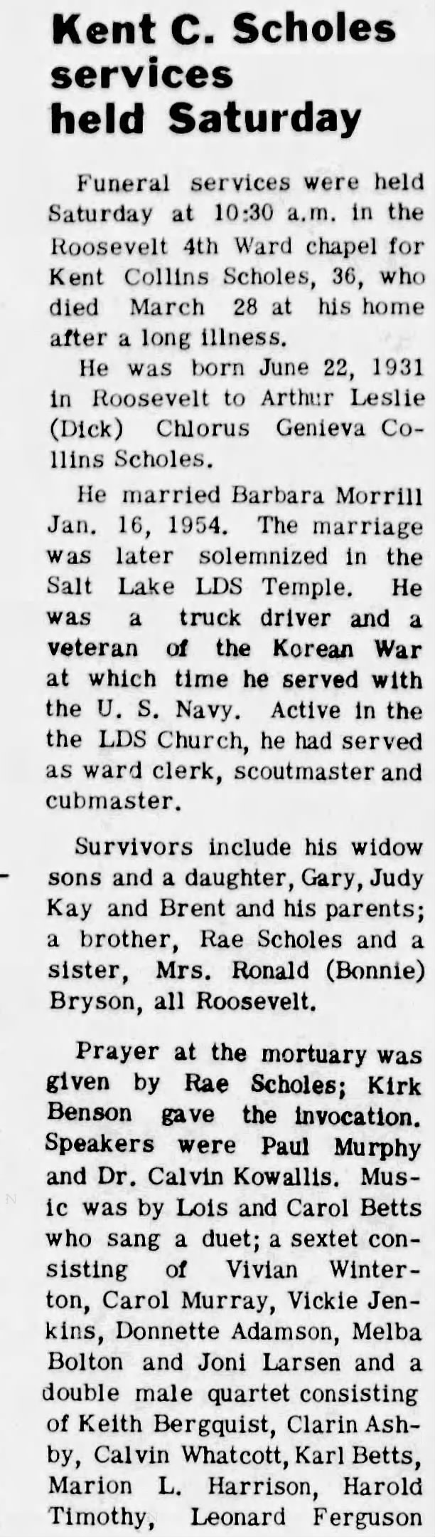 - Kent Collins Scholes was born on 22 June 1931 in Roosevelt, Utah.2,3