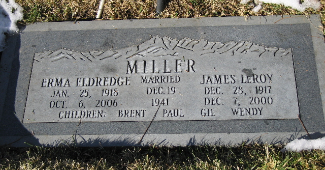 - [S4352] Find A Grave: Murray City Cemetery, Murray, Utah, Erma Louise Eldredge Miller, created by Tim Allen, added Jan 2011, memorial number 64977272.