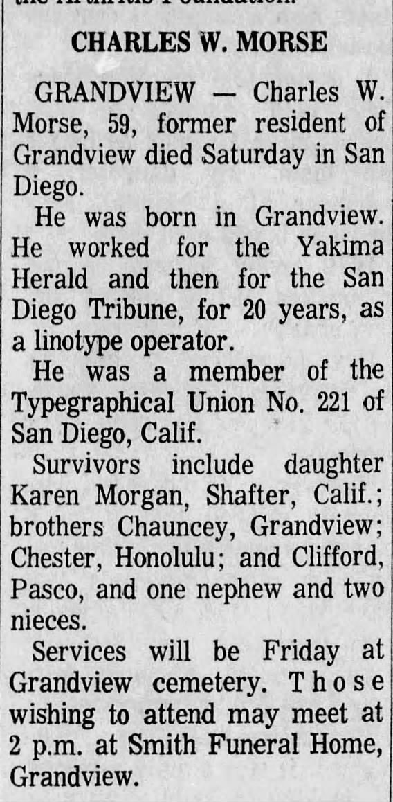 - [S8982] Tri-City Herald, Pasco, WA, Newspaper, obituary notice, Charles W Morse, published 7 Sep 1972 p 10.