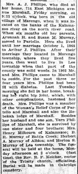- [S5226] Find A Grave: Oakridge Cemetery, Marshall, Michigan, Melissa K Murray Phillips, created by Amy (Decker) Veenendall, added May 2011, memorial number 70687784.