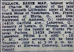 - [S5669] Find A Grave: Elmwood Cemetery, Lorain, Ohio, Sadie May Rockwood Tillack, created by Diane Wargo Medina, LindaB, added Aug 2010, memorial number 56224292.