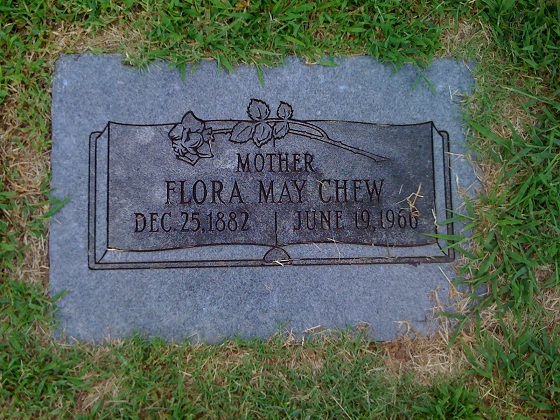 - [S5751] Find A Grave: Forest Park Cemetery, Joplin, Missouri, Flora May Horton Chew, created by Deb64030, D Snyder, added Aug 2010, memorial number 57591365.