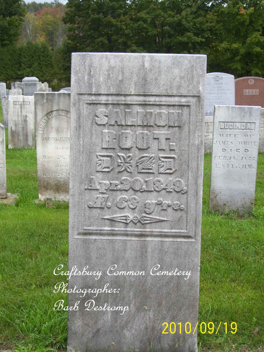 - [S5908] Find A Grave: Craftsbury Common Cemetery, Craftsbury, Vermont, Salmon Root, created by Barb Destromp, added Dec 2011, memorial number 81941729.