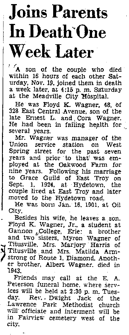 Besides his wife he is surivied by one son, Wayne Wagner of Sunville three grandchildren two sisters Mrs Effie Cook of Lundy Lane Pa. and Mrs Ada Smith of Warren.