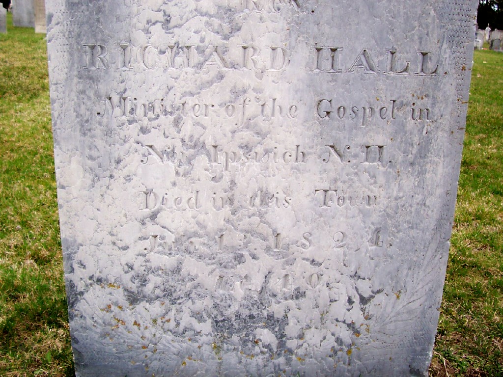 - [S5727] Find A Grave: Evergreen Cemetery, New Haven, Vermont, Rev Richard Hall, created by Alan Lathrop, added Apr 2013, memorial number 109506705.
