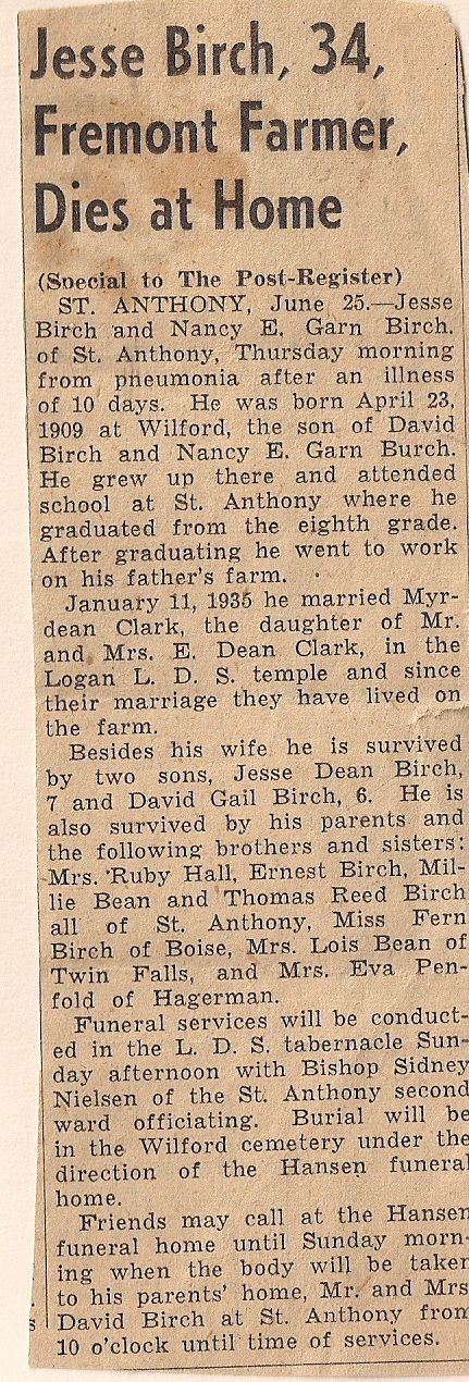 Birth, life, and death were all centered in one place for Jesse Birch --- the family farm in Wilford, Idaho. He was born 23 April 1909 in Wilford, Fremont Idaho. He grew up there and attended school in St. Anthony by commuting the two miles on horseback. After graduating from the eighth grade, he worked full time on his father’s farm.