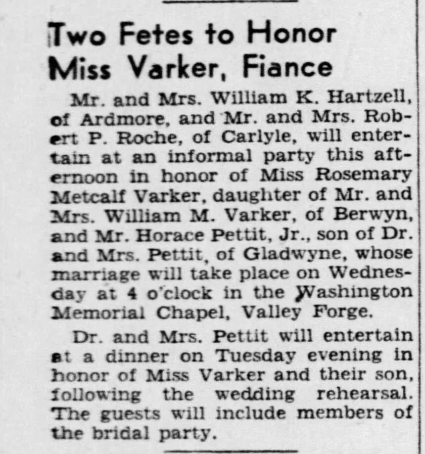 - [S6610] The Philadelphia Inquirer, Philadelphia, PA, Newspaper, Pettit Varker pre-wedding parties, published 13 Mar 1949, p 69.