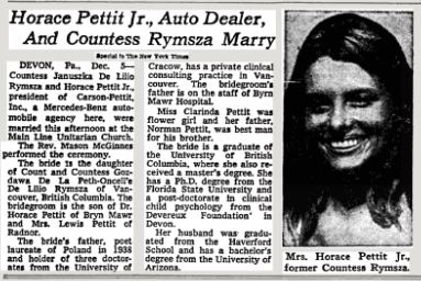 - Januszka married Horace Pettit, son of Horace Pettit and Millicent Hacker Lewis, on 5 December 1970 in Devon, Pennsylvania.1,3