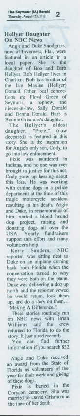 Kerry Sanders, NBC reporter, was sitting next to Duke on an airplane coming back from Florida when the conversation turned to why they were both on the plane. Duke was delivering a dog up north, and the reporter vowed he would return, look them up, and do a story on them....'Making a Difference'.