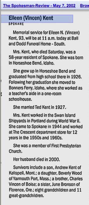 - [S4411] 1940 US Federal Census, Boise City, Ada County, Idaho, digital image Ancestry, National Archives micropublication, Eileen Kent head of household, roll M-10627-00736, enumeration district 1-26, page 1A .
