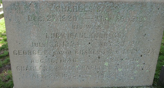 - [S6380] Find A Grave: Forest Dale Cemetery, Malden, Massachusetts, Charles Frederick Cox, created by Deb Robichaud Belcher, added Dec 2016, memorial number 173439404.