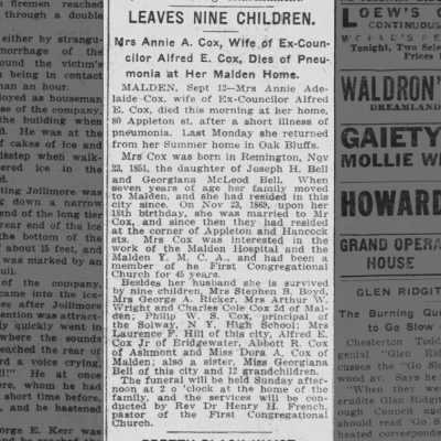 - Annie Adelaide Bell died on 12 September 1913 in Malden, Massachusetts, at age 61.1