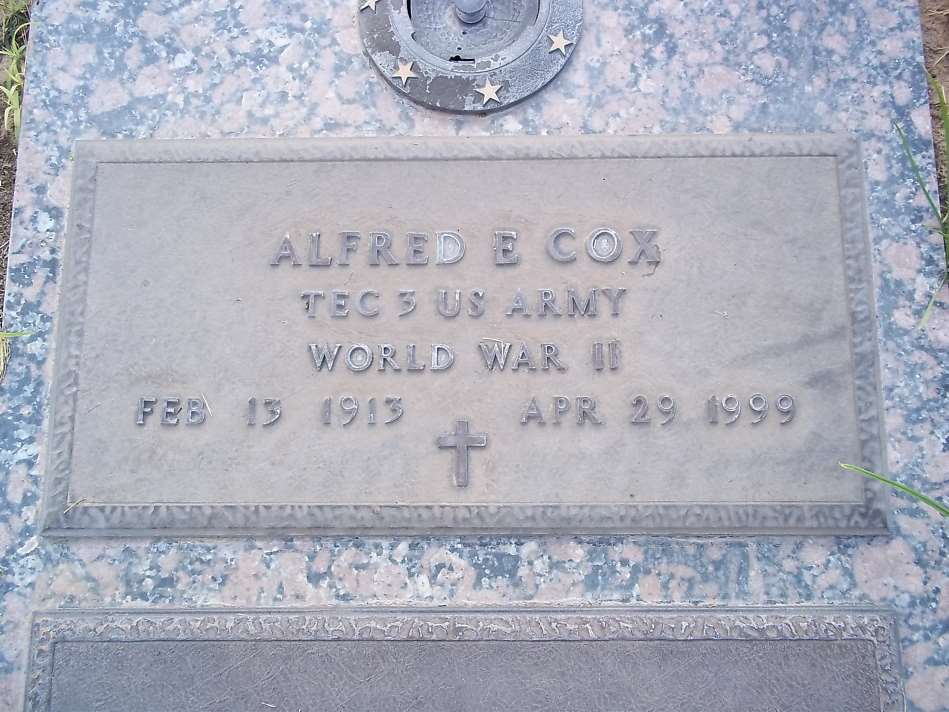 - [S6805] Find A Grave: Vista Verde Memorial Park, Rio Rancho, New Mexico, Alfred E Cox, created by Jay Follett, added Mar 2011, memorial number 66715576.