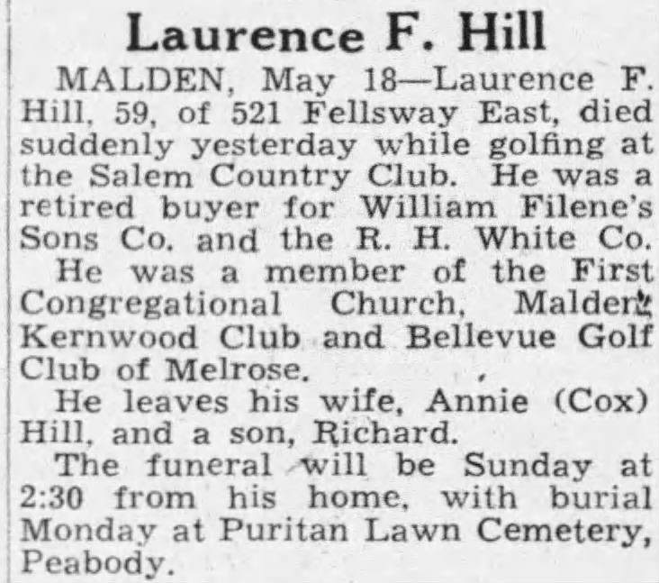 - [S6029] The Boston Globe, Boston, MA, Newspaper, Laurence F Hill obituary notice, published 19 May 1945 p 8.
