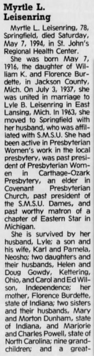 Besides her hsuband of 54 years, Morton, she was preceded in death by her parents and one sister, Myrtle Leisenring.
