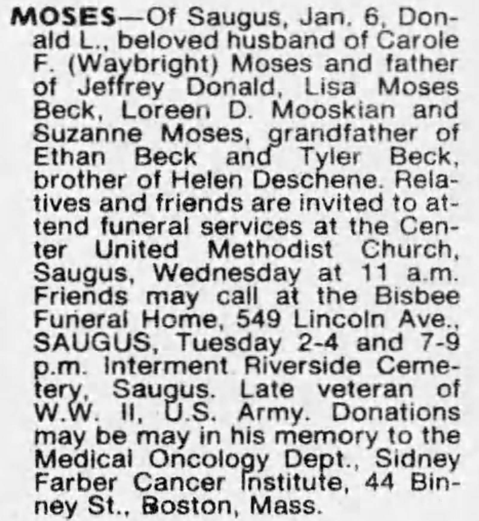 - [S6029] The Boston Globe, Boston, MA, Newspaper, Donald L Moses obituary notice, published 9 Jan 1979 p 32.