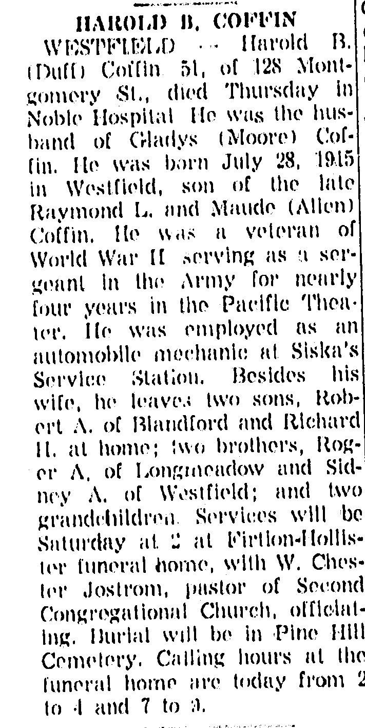 - Harold Bernard Coffin was an automobile mechanic at Siska's Service Station in Westfield.2
