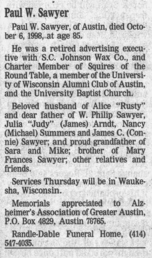 - [S9159] Austin American-Statesman, Austin TX, Newspaper, Paul W Sawyer obituary notice, published 8 Oct 1998 p 18.