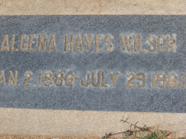 - [S7190] Find A Grave: Hillside Memorial Park, Redlands, California, Algena Hayes Wilson, created by Barbara LeClaire, added Sep 2008, memorial number 29815123.