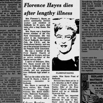 - [S7190] Find A Grave: Hillside Memorial Park, Redlands, California, Frances Louise Harmon Hayes, created by Barbara LeClaire, added Apr 2010, memorial number 20681115.