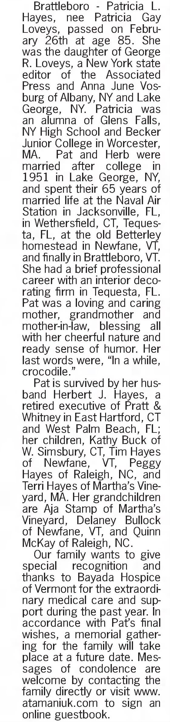 - [S4106] Hartford Courant, Hartford, CT, Newspaper, Patricia L Hayes obituary notice, published 2 Mar 2016 p B12.