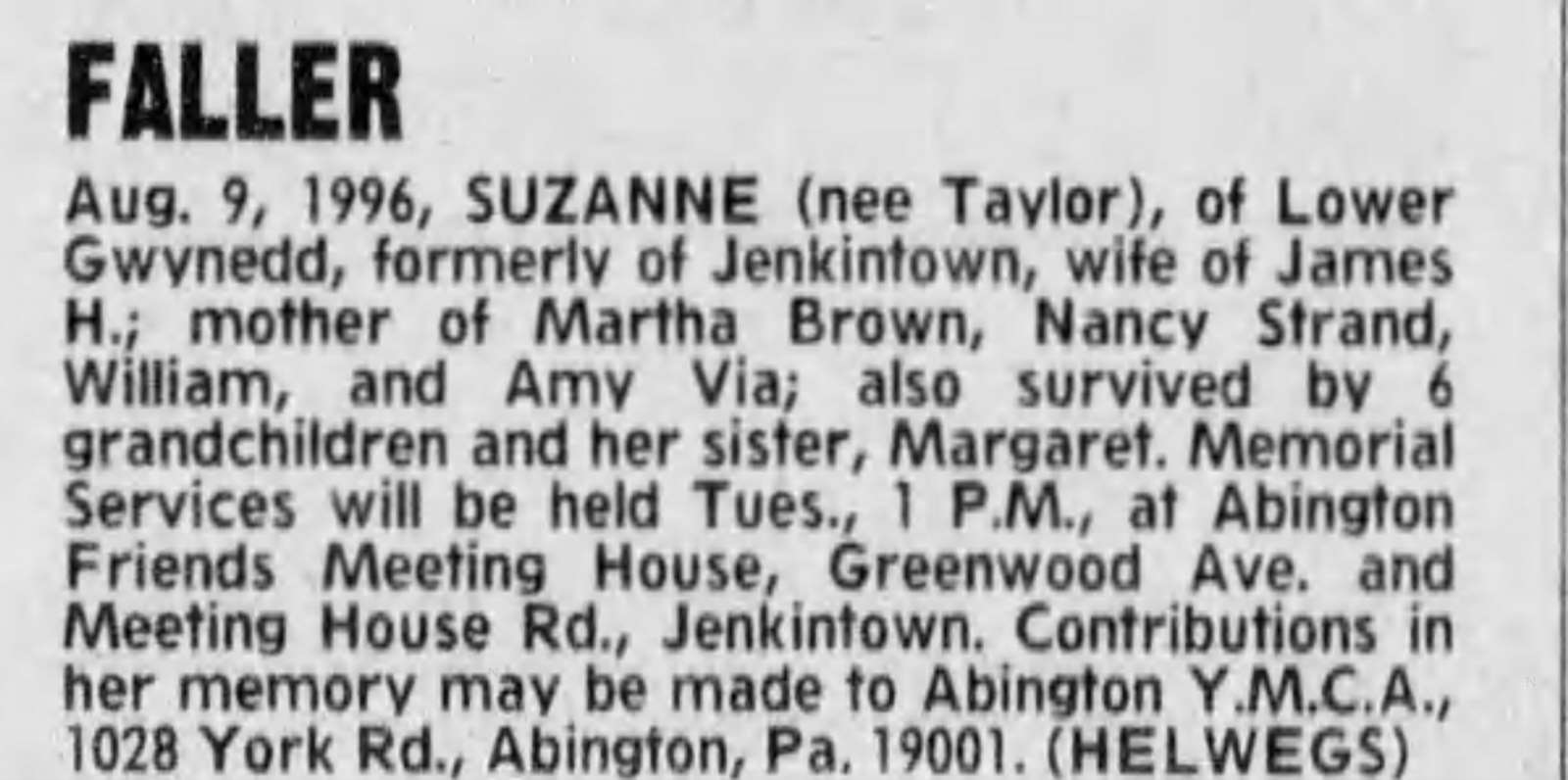 Survivors include Jim's brother, Eugene Faller (Gladys), Bowling Green, Kentucky, and their six children; his three daughters and son; Martha Brown (Anthony) Berkeley, California; Nancy Strand, Bradenton, Florida; William Faller (Casey Jones), Temple, New Hampshire; and Amy Via, White Plains, New York; grandchildren, Simone and Georgia Brown, Jamie and Dylan Strand, Sam and Tess Faller, Rebecca Via; and great-granddaughters Jiana and Eliana Lockett and Beatrix Allore.