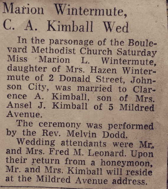- Marion married Clarence Ansel Kimball, son of Ansel Jerome Kimball and Hortense Ellen Twaddell, in 1946.1