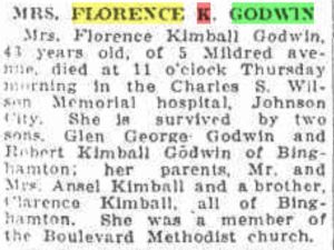 - [S7030] Find A Grave: Floral Park Cemetery, Johnson City, New York, Florence Birdie Kimball Godwin, created by Paul R, added Oct 2010, memorial number 60358682.