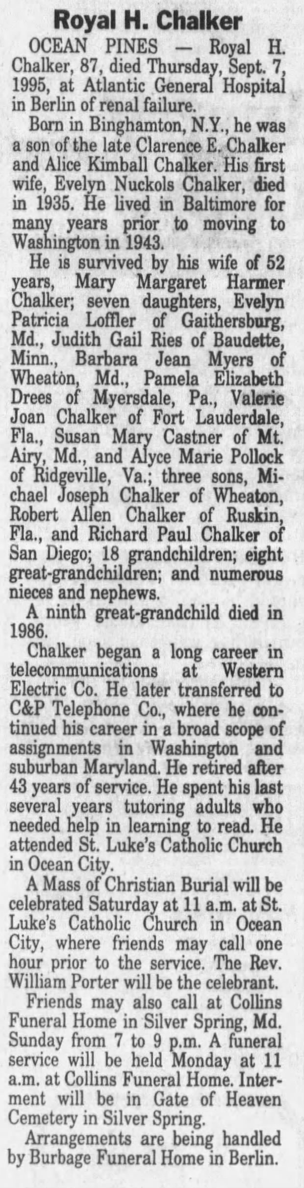 - [S8351] The Daily Times, Salisbury, MD, Newspaper, Royal Chalker, obituary notice, published 8 Sep 1994 p 10.