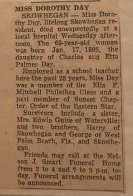 - [S7347] Find A Grave: Southside Cemetery, Skowhegan, Maine, Dorothy Day, created by Gail Kelly, added Mar 2015, memorial number 143900858.