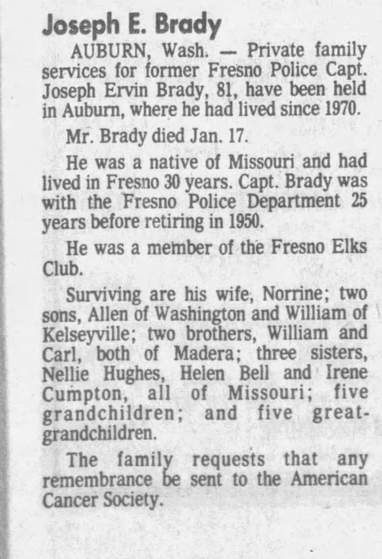 - [S9175] The Fresno Bee, Fresno CA, Newspaper, Joseph # Brady obituary notice, published 24 Jan 1981 p 25.