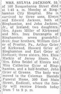 Edith is survived by four sons, Herbert L. (Karen) King Jr. of Forksville, William W. (Doris) King, David A. (Edna) King and Brett W. (Diane) King, all of Hillsgrove; two daughters, Carolyn (Steve) Daniel of Forksville and Linda Folmar (Bob) of Dushore; twenty grandchildren, four step-grandchildren, twenty-seven great-grandchildren, five step-great-grandchildren and a great-great-grandchild.