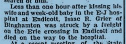 Less than one hour after kissing his wife and week-old baby in the E-J hospital at Endicott, Isaac R Grier of Binghamton was struck by a freight on the Erie crossing in Endicott and died on the way to the hospital.