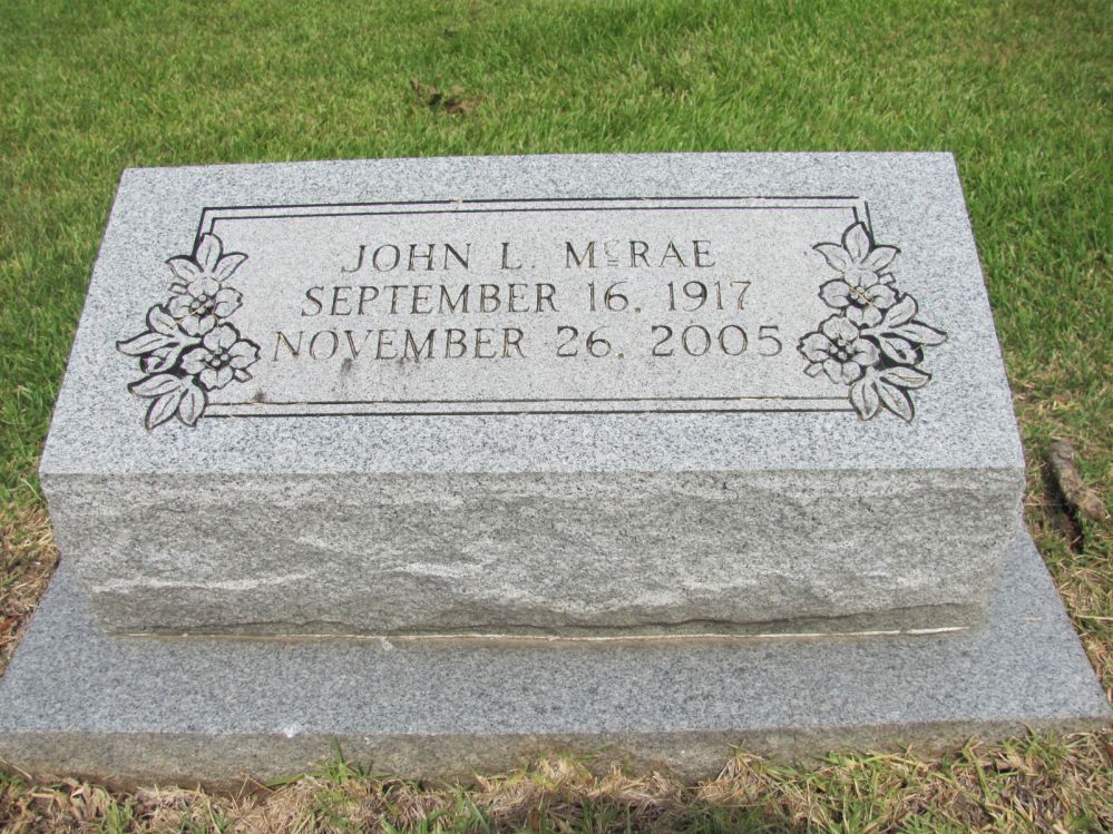 John Leonidas McRae, Civil Engineer/Consultant, died Saturday, November 26, 2005, at the age of 88, in Knoxville, Tennessee, of natural causes. Born in Acona, Mississippi, Holmes County, September 16, 1917, he was the son of the late James Wright McRae and Lota O'Bryant McRae. Mr. McRae, a resident of Vicksburg for over 50 years, is survived by his son, John M. McRae and wife, Sharon, of Knoxville, Tennessee and daughter, Margaret Murphree, and husband, Boyd, of Tallahassee, Florida, and six grandchildren. Mr. McRae's wife, Thelma, died in January, 2000.