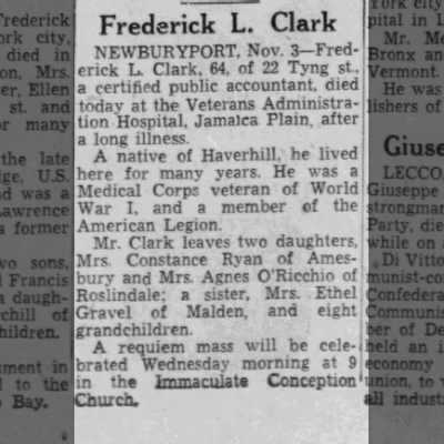 - Frederick Lewis Clark was born on 28 December 1892 in Bradford, Massachusetts.1,2