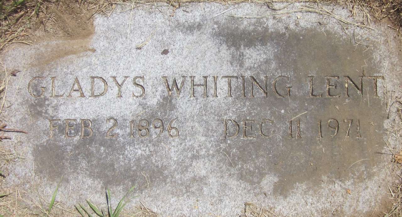 - [S7141] Find A Grave: Lindenwood Cemetery, Stoneham, Massachusetts, Gladys Whiting Lent, created by Shawn Ventura, Angiul, added Jul 2015, memorial number 149625286.