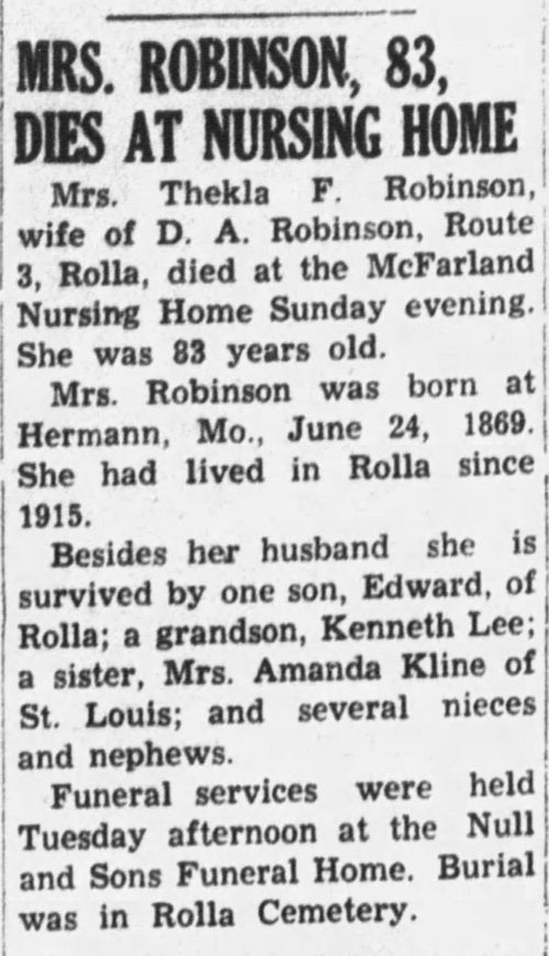 - [S7282] Find A Grave: Rolla Cemetery, Rolla, Missouri, Thekla Feil Robinson, created by Anonymous, added Dec 2011, memorial number 82359350.