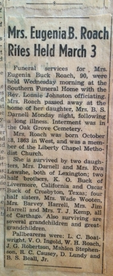 - [S7922] Find A Grave: Oak Grove Cemetery, Lexington, Mississippi, Eugenia Sarah Buck Roach, created by Dudley Rinicker, added Jun 2010, memorial number 53958014.