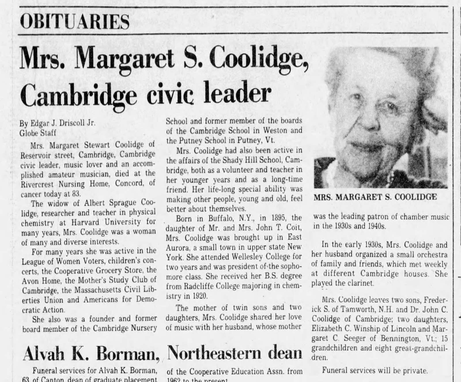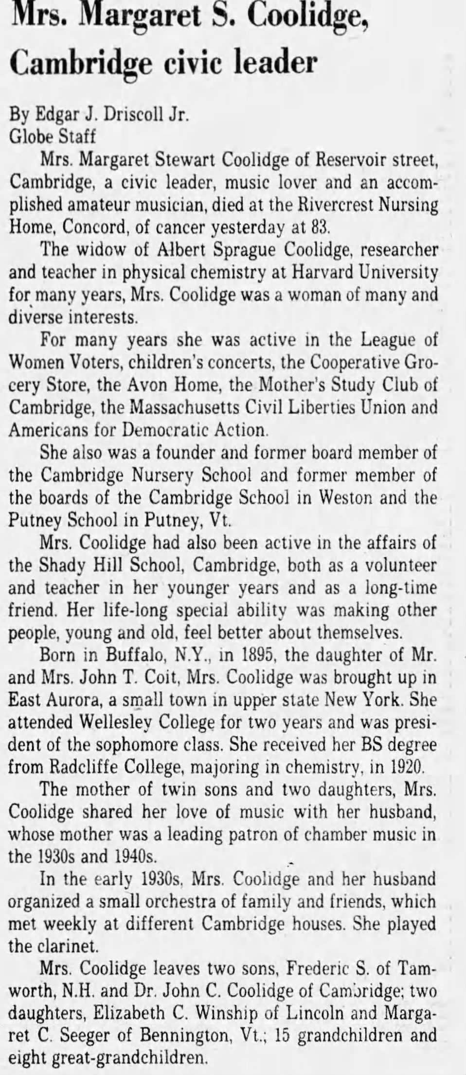 SEEGER, Margaret Coolidge "Maggie" Of Arlington and Cambridge, Massachusetts, born June 10, 1928 in Pittsfield, Massachusetts, passed away peacefully on June 21, 2018 in Raleigh, North Carolina, age 90. Maggie led an active and independent life, charting her own course in ways that were far outside the mainstream for her times. As a young woman she taught herself to play guitar and sing cowboy songs, rejecting her family's long traditions in classical music (she was the last surviving grandchild of American classical music patron Elizabeth Sprague Coolidge). In 1948 while attending Stanford, she married a fellow student, Sully Marsden, a PhD candidate in Chemistry who had worked on the atom bomb project in Oak Ridge TN. They moved to India with their infant son Lee in 1950, where Sully was instrumental in establishing India's first National Chemical Laboratory, in Pune, near Mumbai. Maggie embraced the people and culture. While there, she contracted polio and was briefly unable to walk. Under the care of Dr. Banoo Coyaji, she recovered completely except for a slight limp which re-appeared in her 70's. Dr. Coyaji was an activist in family planning and population control and director of King Edward Memorial Hospital in Pune. She and Maggie remained friends long after Maggie left India. The family had grown to include Joe and Mary when they left in 1953. In the US, the family lived in State College, PA, where Annie was born, then moved to California in 1957. Maggie was divorced in 1958 and became responsible for raising the four children. As part of her children's "education", she included drives across the country, trips to Mexico where she bought good guitars cheaply for friends (she learned to bargain in India) and smuggled illegal fireworks through customs with the children by hiding them (the fireworks, not the children) in door panels of the family VW bus. Unlike classical music, Mexican fireworks were a family tradition Maggie embraced. She later returned to Stanford and completed her degree and at age 46 she attended the Fanny Allen School of Nursing in Winooski, VT, subsequently working as a visiting nurse. During her life, Maggie participated in 56 Sierra Club and other organized (and dozens of disorganized) hiking, sailing, bicycle, kayak and canoe trips; usually as leader, assistant leader or commissary. She also traveled with family and friends to Tibet, China and Europe. Her avid commitments to life served as an inspiration and example to those who knew her. Maggie loved reading, writing (especially poetry), music (guitar, banjo, piano, viola and singing), skiing, snow shoeing, gardening and animals, particularly horses and cats. She is survived by sons Lee and Joe Marsden, daughters Mary Hilton and Annie Robbins, seven grandchildren and three great grandchildren. Preceded in death by brothers John C. Coolidge, MD and Fredrick S. Coolidge, an architect, and sister Elizabeth Winship, who for years wrote for the Boston Globe and later syndicated Ask Beth column, Maggie's second husband, Dewey Seeger, who she married in California and moved with to Lyndonville, Vermont, and parents Albert Sprague Coolidge, a Harvard physics professor, and Margaret Coit Coolidge. Special thanks to the staff at Elmcroft of Northridge in Raleigh, NC for their wonderful care during Maggie's last 18 months, the staff and friends at Newbury Court in Concord, MA before that, as well to her wonderful friends and neighbors in Arlington, MA. Donations in Maggie's name to the Sierra Club or Planned Parenthood are welcome and appreciated. The family plans a memorial service at a time to be determined. A service of Bright Funeral Home & Cremation Center, 405 S. Main Street, Wake Forest, NC 27587. www.brightfunerals.com Communications e-mailed to LeeMarsdenLaw@Gmail.com will be shared with the family.