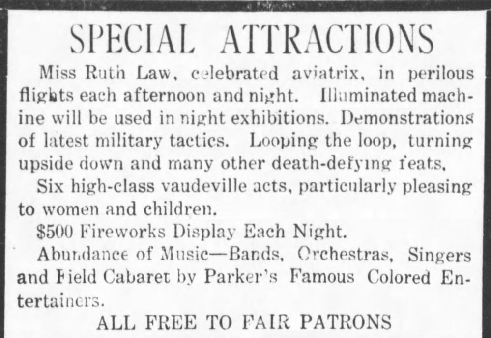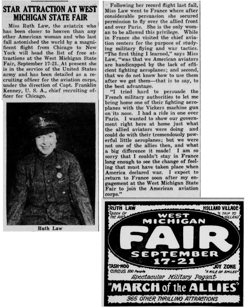 Ruth was a famous airplane flier - she performed at fairs. The 1st notice refers to a fair on 23 Aug 1917 in Greenville OH, the next a fair in Michigan.