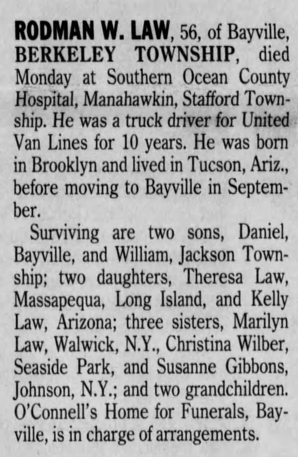 - [S7992] Asbury Park Press, Asbury Park, New Jersey, Newspaper, Rodman W Law, obituary notice, published 8 jan 1997.