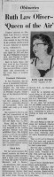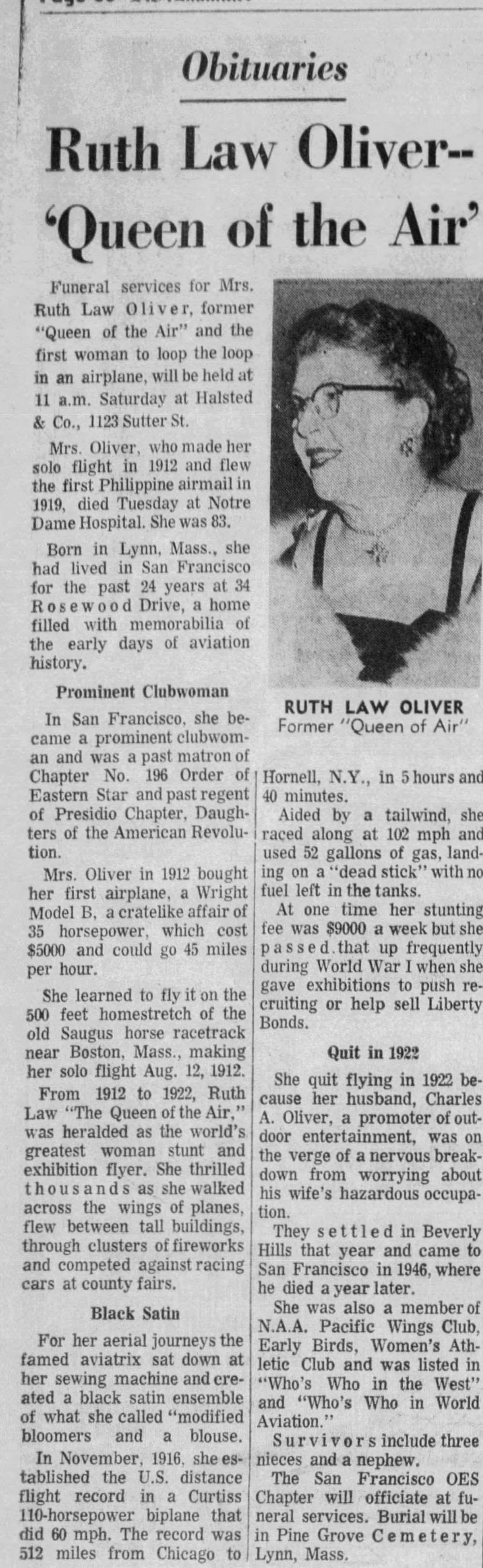 - [S7997] The San Francisco Examiner, San Francisco CA, Newspaper, Ruth Law Oliver, obituary notice, published 3 Dec 1970.