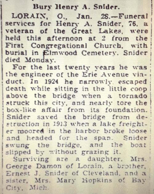 - [S5669] Find A Grave: Elmwood Cemetery, Lorain, Ohio, Henry Andrew Snider, created by Msmith, added Jan 2016, memorial number 156635770.