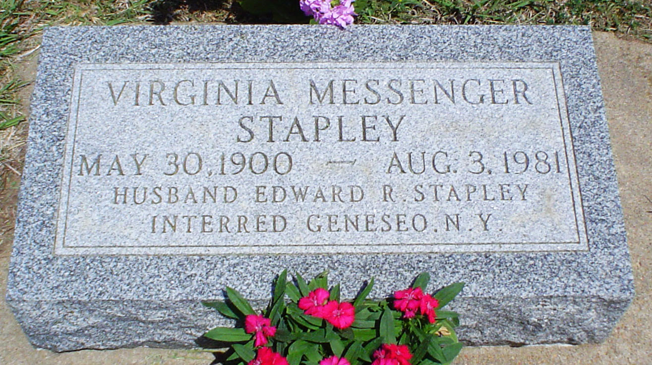 “Virginia Messenger Stapley. Virginia Messenger Stapley, 81, sister of the late Fred and William Messenger, died August 3, 1981, in Stillwater, Okla. She had been in a rest home there for a number of years. Graveside services were Thursday morning at the Cleveland Cemetery with the Livingston Mortuary in charge. The Rev. Dale Gates officiated.