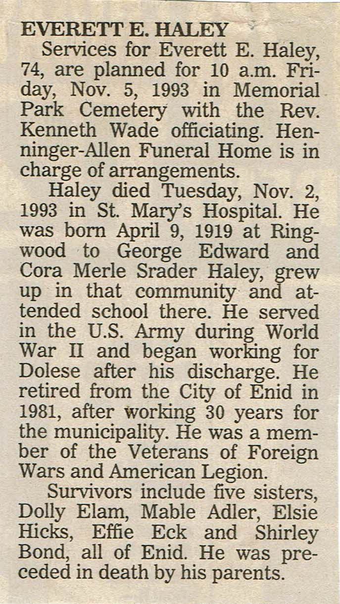 Funeral for Mable L. Adler, 92-year-old former Enid, Okla., resident, is 2 p.m. today, Sept. 27, 2014, at Henninger-Hinson Funeral Home Chapel. The Rev. Gail Edmison will officiate. Burial will follow at Memorial Park Cemetery. Mable was born Oct. 20, 1921, in Ringwood, Okla., to Ed and Cora (Srader) Haley and died Wednesday, Sept. 24, 2014, at Sumner Regional Medical Center, Wellington, Kan. She attended school in Ringwood and graduated with the class of 1939. She attended school in Ringwood and graduated with the class of 1939. On June 23, 1944, she married Charles Adler in Oakland, Calif. Mable was a welder in the Navy shipyards, helping with the war effort. She and her sister also were riveters in Seattle during the war. When the war was over she and Charles moved to Enid, where she was a supervisor at NORCE (then Enid State School) for nearly 30 years. After her retirement, she cared for the elderly, either in the nursing home or in their home. She was a life-long caregiver. She is survived by her sons, Bill Adler and wife Debbie of Putnam City, Okla., and Larry Adler and wife Jeannie of Mulvane, Kan.; seven grandchildren; 17 great-grandchildren; one great-great-grandchild; three sisters, Elsie Hicks, Effie Eck and Shirley Hays; and numerous nieces, nephews and cousins. She was preceded in death by her parents; a brother, Everett; a sister, Dolly; and an infant daughter, Sancy Lee. Condolences may be made to the family at www.enidwe care.com. (Submitted by family)